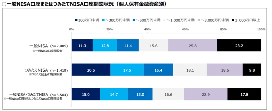 一般NISA口座開設者の保有金融資産は、500万円未満が約35%、つみたてNISA口座開設者の保有金融資産は、500万円未満が約53%となっています。