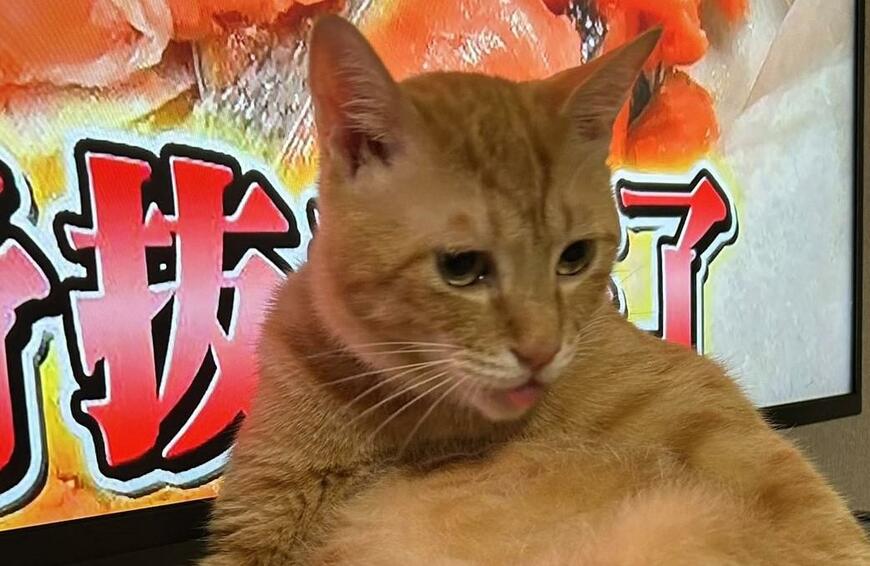 「骨抜」の文字を背に、舌とお腹をしまい忘れ「ダラダラ」する猫さん。ほほえましい一コマがX(旧Twitter)で注目を集めています。
