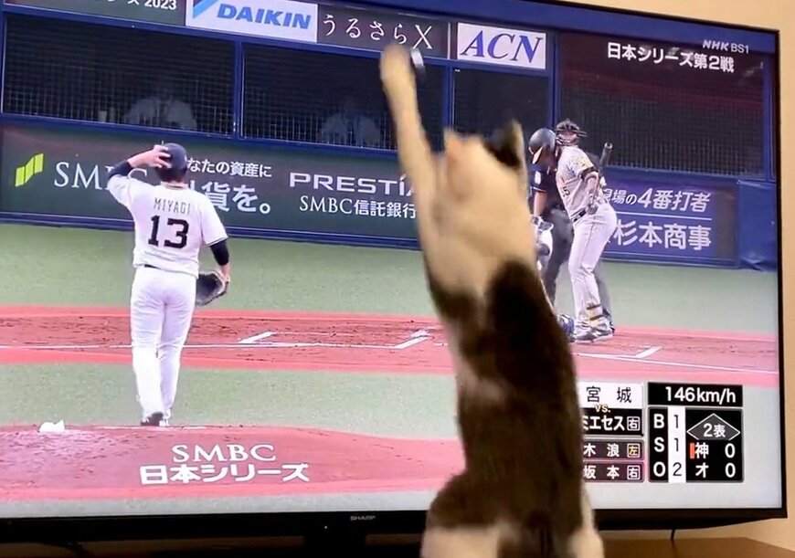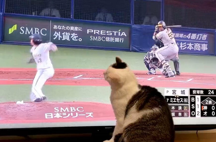 そこに写っているのは、猫の「金四郎」くんの姿です。金四郎くんが夢中になっているのは、日本シリーズの第2戦「阪神タイガース対オリックス・バファローズ」。