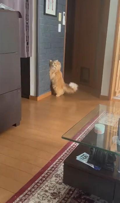 そこに写っているのは猫の「エマ」ちゃん。しばらく壁に張り付き、キッチンのある奥の方を覗いていました。