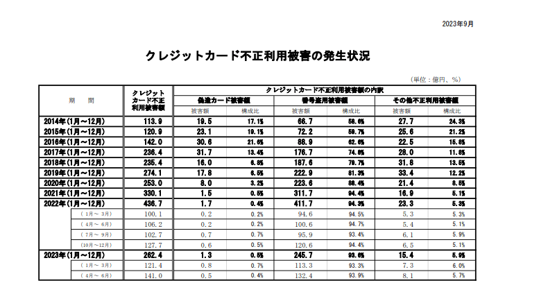 2023年1月〜6月の合計は262.4億円となっていることから、2023年のクレジットカード不正利用被害額については過去最高のペースです。