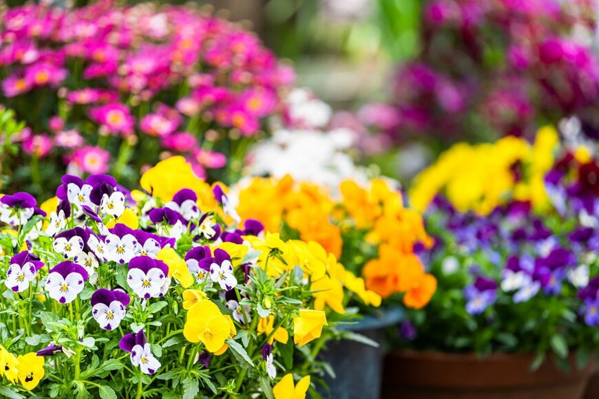 パンジー・ビオラ、ネメシアは、ひとつの鉢に数株植えると、鉢いっぱいに花が咲く植物です。華やかな見た目が楽しめるので、寄せ鉢にもおすすめです。