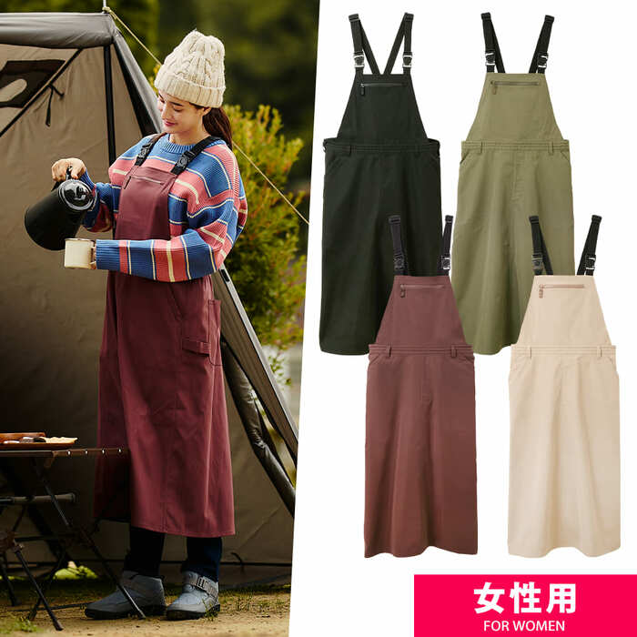 秋冬の新作アイテムです。スカートタイプのサロペットで女性らしさを演出。また、使用されている「フレイムテック」素材は、飛び火による穴あきがしにくい特性があり、キャンプでも気兼ねなく着用できます。