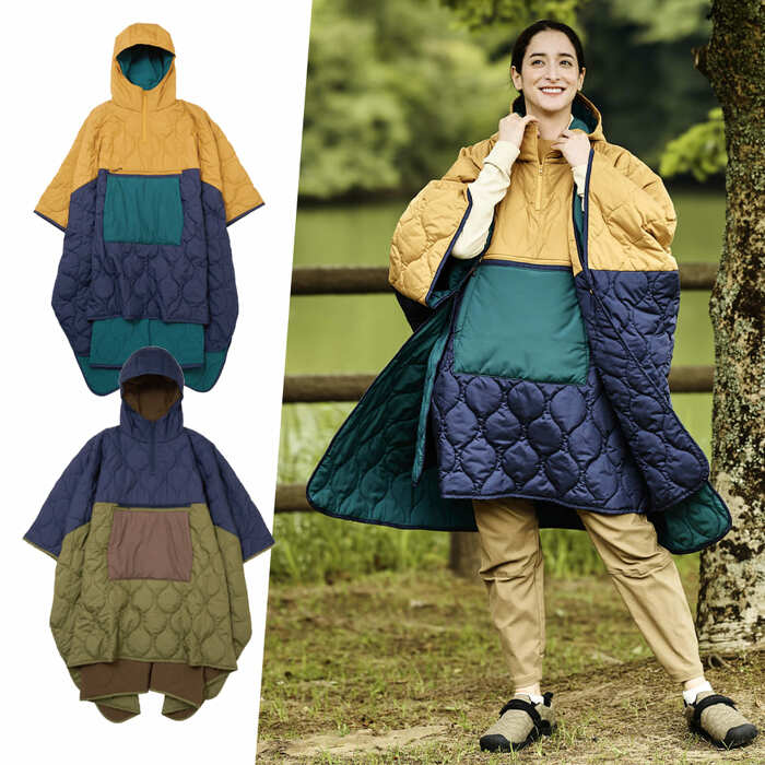 こちらのポンチョは、火の粉に強い素材を使用しています。焚火の側で着用しても安心できるので、キャンパーから人気が出ています。ポンチョとしてだけでなく、ブランケットやクッションとしても使える点も魅力のひとつです。