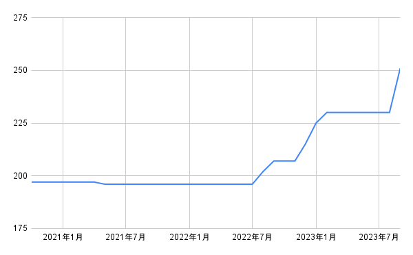 なお、全都市の小売価格の平均は268円(2023年9月時点)、前年同月比では6%の伸びとなっています(いずれも小数点第一位を四捨五入)。