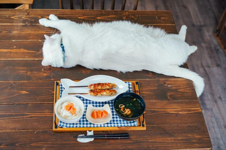 「猫ちゃんを眺めながら食べるごはん」の様子がX(旧Twitter)で注目を集めています。