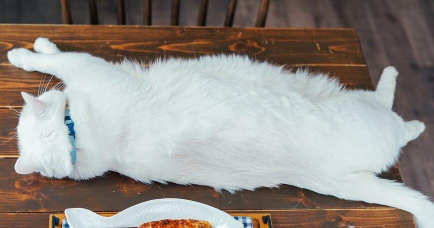 そこに写っているのは、テーブルの上に並んだご飯の奥で横たわる、1匹の猫ちゃんです。今回話題になったのは、白猫の男の子「ブラン」くん。