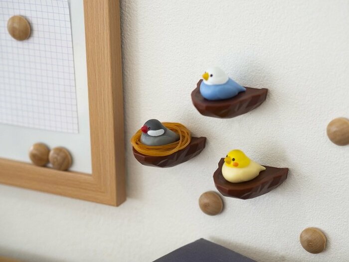 トリのフィギュアに輪ゴムをかけることができます。フィギュアの種類は、セキセイ・オカメ・ナミ文鳥の3種類です。かわいらしい小鳥が大集合しています。