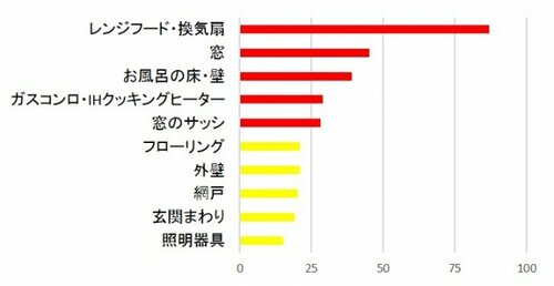 また、汚れが気になる場所の1位は「レンジフード・換気扇」。2位「窓」、3位「お風呂の床・壁」、4位「ガスコンロ・IHクッキングヒーター」、5位「窓のサッシ」などを大きく引き離してのトップになりました。とはいえ、やはりキッチンや窓まわりの汚れが気になる人が多いことがわかる結果ですね。これらの場所は、掃除に手間や時間がかかることもネックといえそうです。