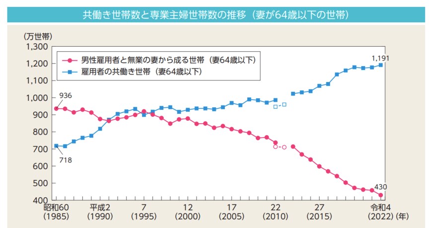 最新である令和4年には、専業主婦世帯は約430万世帯、共働き世帯は約1191万世帯という集計結果に。