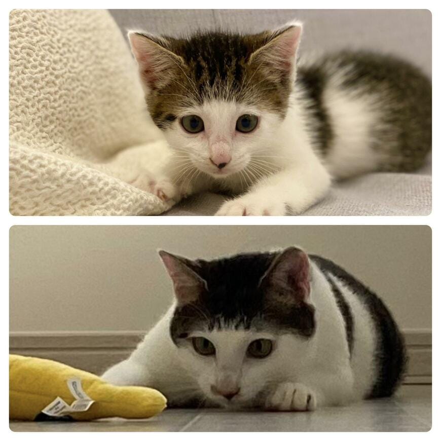 「前髪のびてる」というコメントとともに投稿されたのは、1枚の写真でした。そこに収められているのは、猫ちゃんの子猫時代と成長後の写真。