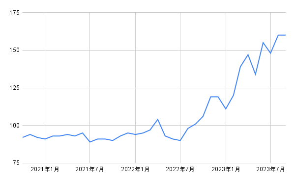 なお、全都市の小売価格の平均は120円(2023年9月時点)、前年同月比では17%の伸びとなっています(いずれも小数点第一位を四捨五入)。