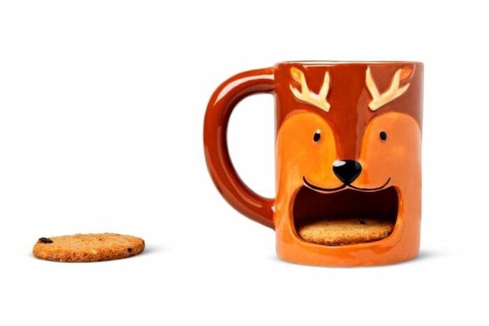 大きくあいたトナカイの口部分にクッキーを入れられる、ユニークすぎるマグカップ。あたたかいドリンクと一緒にスイーツを楽しみたいときにぴったり!ティータイムの相棒におすすめのマグカップです。