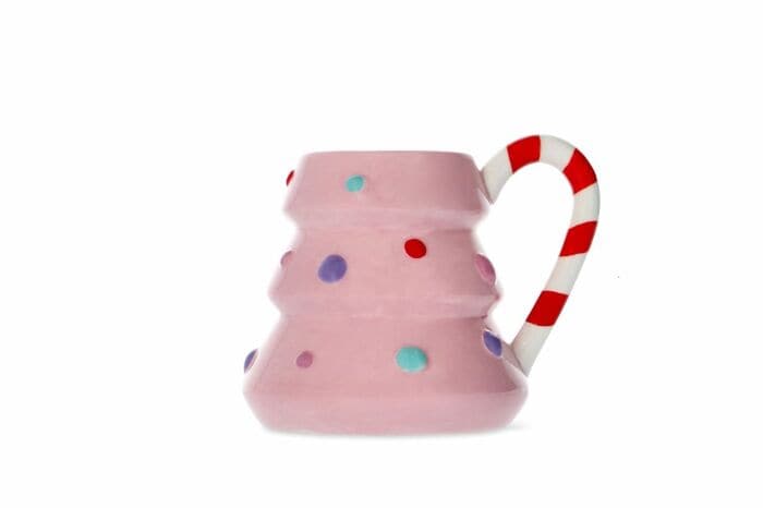 ピンクカラーのツリーにオーナメントが輝くマグカップです。ハンドル部分は、赤と白の縞模様がかわいいステッキ型のキャンディ〈キャンディケーン〉のデザイン。