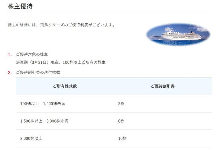 株数に応じて、「決算期後の7月1日より翌年9月30日までのクルーズ」で「優待割引券1枚につき1クルーズ1名様10%の割引」が利用できます。