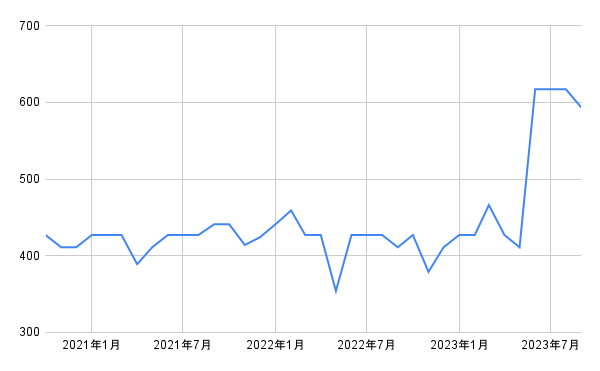 なお、全都市の小売価格の平均は467円(2023年9月時点)、前年同月比では19%の伸びとなっています(いずれも小数点第一位を四捨五入)。