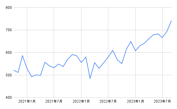 なお、全都市の小売価格の平均は629円(2023年9月時点)、前年同月比では6%の伸びとなっています(いずれも小数点第一位を四捨五入)。
