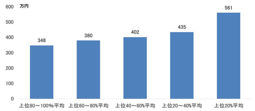 続いて収入をみてみると、70歳代二人以上世帯の平均収入は425万円でした。総務省では2022年に貯蓄額をもとに上位から5グループに分けた各グループの平均年収を集計しています。