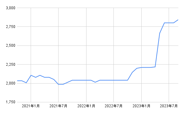 なお、全都市の小売価格の平均は2584円(2023年9月時点)、前年同月比では20%の伸びとなっています(いずれも小数点第一位を四捨五入)。