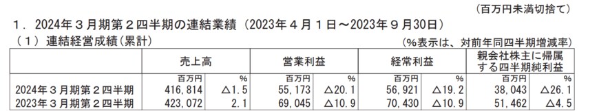 売上高は、前年同期比▲1.5%の4168億1400万円であった。