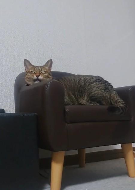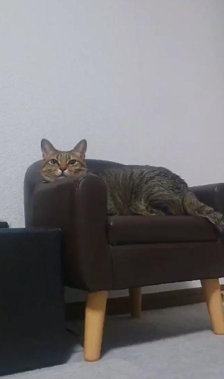 猫ちゃん用のソファに座ってくつろぐもなちゃん。飼い主さんに名前を呼ばれると、「ンニャァ~…」と嬉しそうな声でお返事します。目を細めてウットリした表情はとっても、幸せそうです。