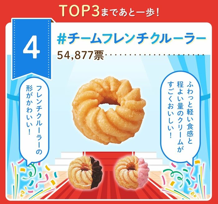 ほのかな卵風味の軽い生地で、食べやすさ抜群のフレンチクルーラー。ふわっとやさしい食感とは裏腹に、シンプルなおいしさがぎゅっと詰まっています。かわいいうずまき型とふわっと軽い食感が自慢のシリーズです。前回も4位だったチームフレンチクルーラーは TOP3まであと一歩ですね。