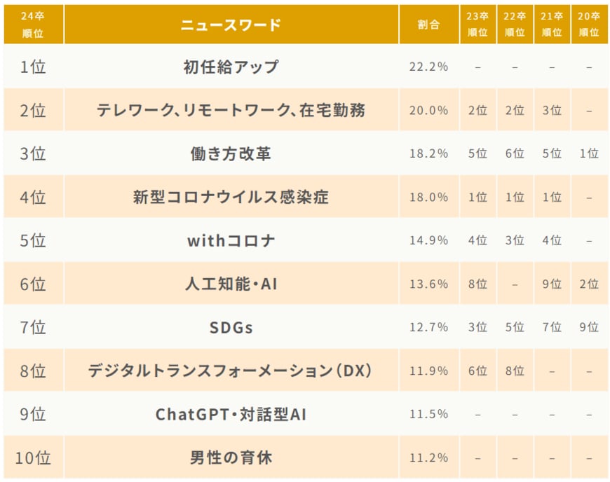 24卒(2024年に卒業する学生)の学生が就職活動に影響したニュースワードがマイナビの調査により発表されました。筆者も24卒の大学生。同じ時期に就活に励んだ仲間たちの注目するニュースは気になります。