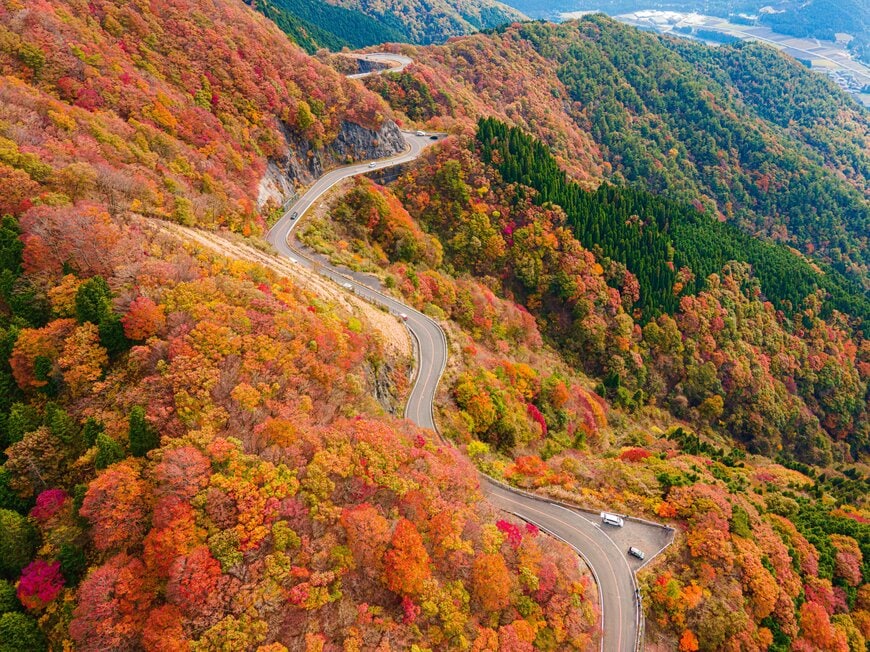伊吹山ドライブウェイは、日本百名山に登録されている伊吹山の山頂を目指す、全長17kmの道です。山肌を縫うように道路が設けられており、秋は紅葉した木々を眺めながら走り抜けることができます。