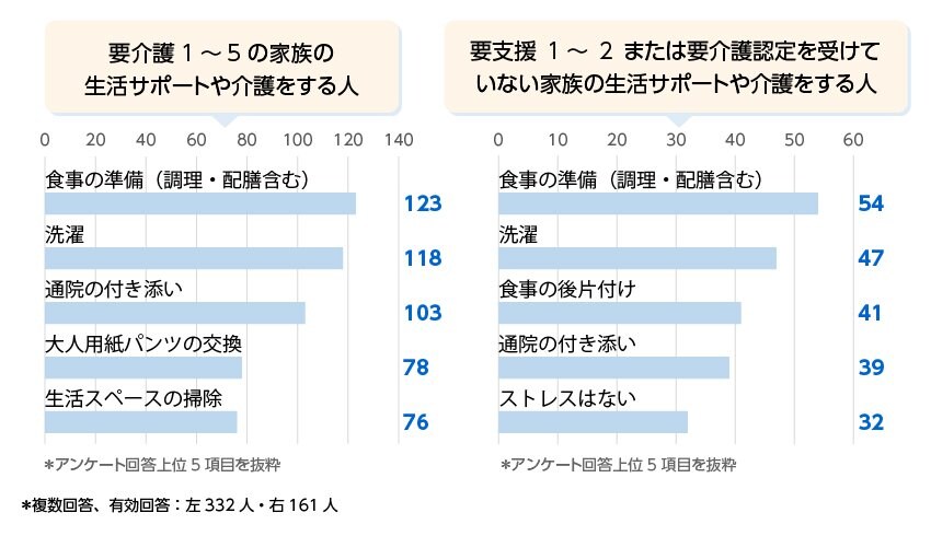 その結果、要介護1~5の家族を在宅介護する人がストレスに感じていることのトップ3は「食事の準備」「洗濯」「通院の付き添い」でした。