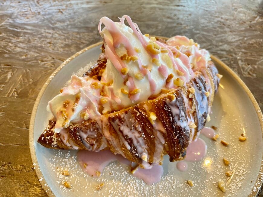 実際に食べてみると、サクサクの香ばしいクロワッサンに、ひんやりとしたバニラアイス、ストロベリーのほのかな酸味が絶妙なバランスで味わえる一品。見た目ほど甘くはないので、意外と食べ進めることができますよ。