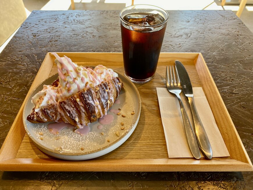 今回はスタッフさんのおすすめで、オカカフェならではの人気メニュー「クロワッサンソフトクリーム バニラストロベリー(660円・税込)」と、この日はとても暑かったので「アイスコーヒー(490円・税込)」を注文。