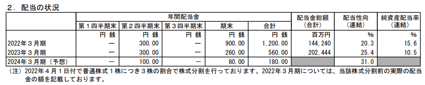 商船三井の株式を1年前に買い、持ち続けたとすると、「2023年3月期の期末配当と2024年3月期中間配当」の計2回を受け取ることができます。