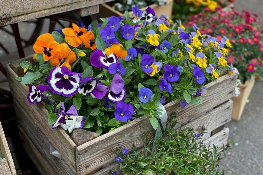 パンジー・ビオラはそれぞれを単独で植えても良いのですが、メインの植物を2株以上植えられるスペースがあるなら、パンジーとビオラの両方を植えて、さらに華やかな雰囲気を楽しみましょう。