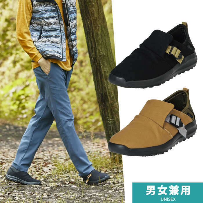 キャンプだけでなく、日常使いもできる見た目が魅力のアイテム。こちらも火の粉に強い素材が使われているので、焚火前でも安心して履くことができます。かかとを踏んで履ける2WAY仕様なので、脱ぎ履きが多いシーンにもおすすめです。