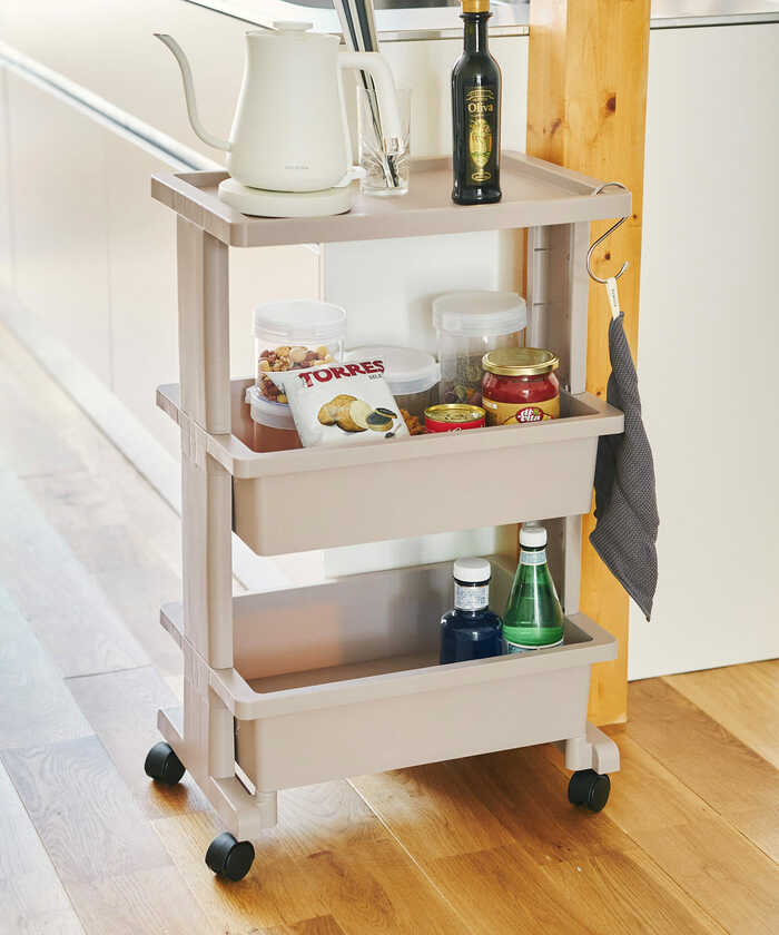 はめ込み式で簡単に組み立てができる、シンプルなキッチンワゴンです。プラスチック素材のなかでも軽い素材のポリプロピレンでできています。落ち着いたベージュカラーで、どんなキッチンにもなじみやすい、高みえするデザインも人気です。