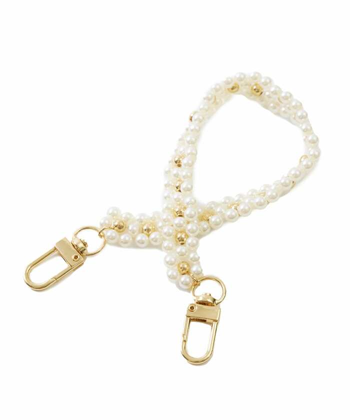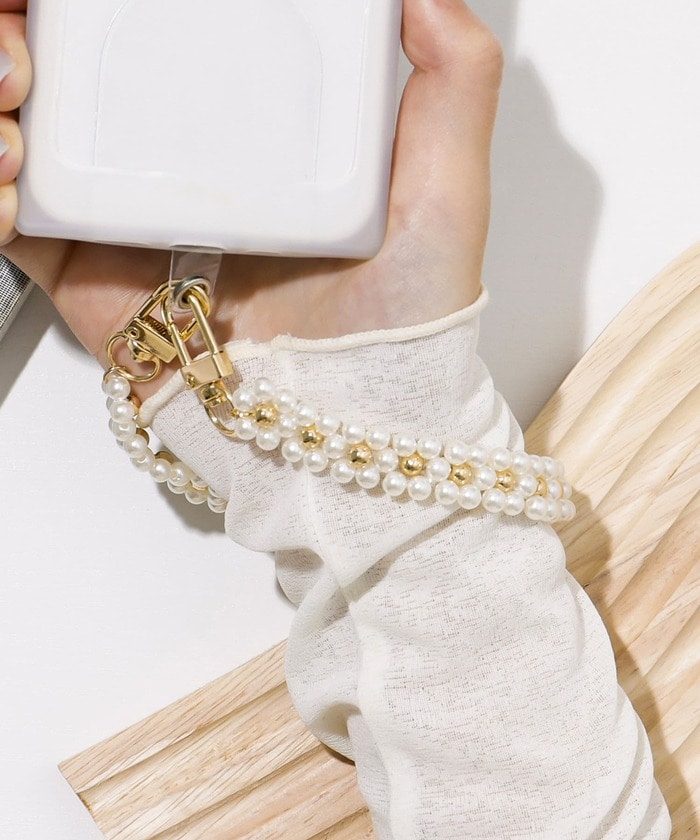 連なった花のデザインがかわいいスマホハンドストラップ。パールはゴールドの金具で高級感を、クリアはシルバーの金具で落ち着いた雰囲気です。主張しすぎないフラワーモチーフが使いやすいと評判で、幅広い年齢層に支持されています。スマホに取りつけるだけではなく、パスケースや携帯用扇風機にも取り付けが可能。アクセサリー感覚で持てるストラップです。