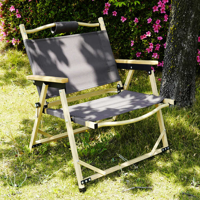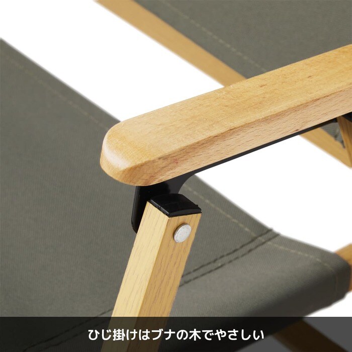 また、座面の本体部分には、燃え広がりにくい加工を施し、キャンプに適した仕様に。ひじ掛けはブナの木を使用しているので、やさしさがありアウトドアにとてもマッチした設計となっています。チェアは組み立て式なので、使わない時は折り畳んで薄く持ち運ぶことができます。レビューでは、自分の分はもちろん、気に入って家族の分を買い足したという意見も見かけました。
