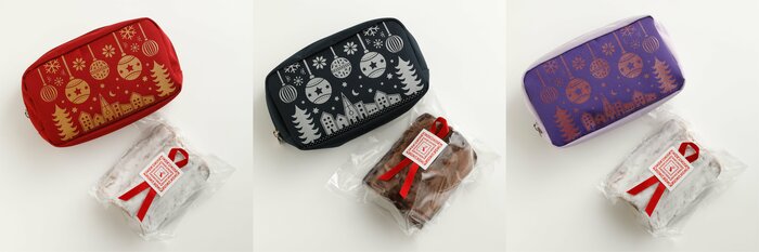 今年のポーチは、レッド・パープル・ネイビーの3種類を展開。レッド、パープルのポーチには、白い粉糖がかかったマジパンシュトーレンが、ネイビーのポーチには、チョコレート味のシュトーレンがそれぞれセットになっています。