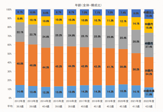フラット35の利用者の平均年齢については年々上昇傾向となっており、2022年度は前年度比+1.3歳の42.8歳となっています。
