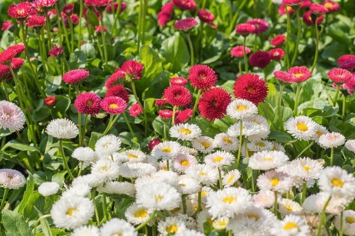デージーは耐寒性があり冬から春まで長い期間咲き続けます。コロンとした丸い花がポップな印象で、花色は白・ピンク・赤など。コンパクトな草姿で寄せ植え向きです。※参考価格:100~300円前後(3号ポット苗)