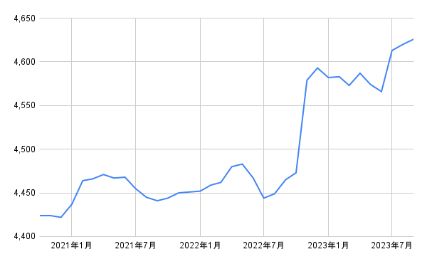 なお、全都市の価格の平均は4312円(2023年9月時点)、前年同月比では0%の伸びとなっています(いずれも小数点第一位を四捨五入)。