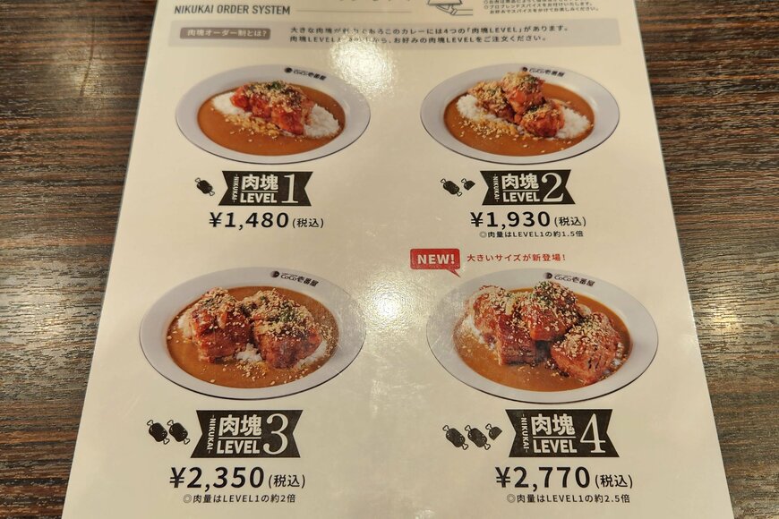 注文時に肉の量を選択する「肉塊オーダー制」を取る肉塊カレー。4月の販売時はレベル1〜3まででしたが、今回はレベル4(肉の量はレベル1の約2.5倍)が追加されているのです。