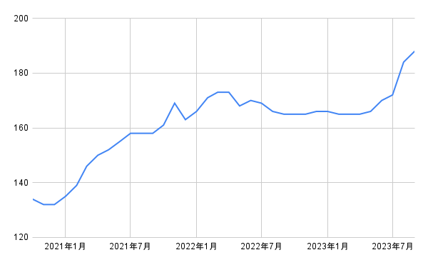 なお、全都市の価格の平均は185円(2023年9月時点)、前年同月比では9%の伸びとなっています(いずれも小数点第一位を四捨五入)。