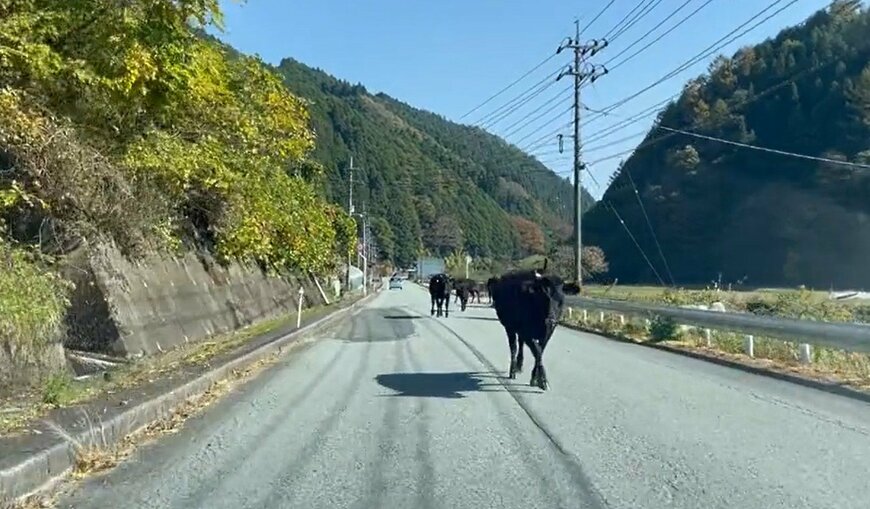 動画は岡山県の道路で撮影されたものですが、なんと向かい側からは「牛の群れ」がやって来ました。ゆっくりと歩く牛たちは、みんな交通ルールを守るように左側を歩いています……。