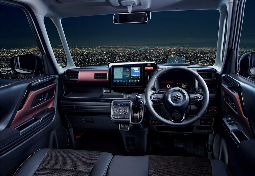 スペーシアカスタムのインテリアはブラックを基調とし、セミマットな質感のボルドーと光沢のあるピアノブラックの加飾により、上質で落ち着いた雰囲気を演出しています。また、スエード調起毛で仕上げたシート表皮、さらにHYBRID XS、HYBRID XSターボは、上質感を高めるシートサイド部を艶のあるパイピングを施したレザー調となります。