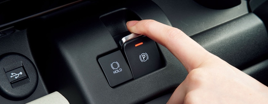 これまでの足踏み式パーキングブレーキに変わり、スイッチひとつで簡単に操作できる電動パーキングブレーキを搭載しています。電動パーキングブレーキはシフト操作やアクセルと連動してパーキングブレーキが作動・解除。また、停車中ブレーキペダルから足を離しても停車状態をキープするブレーキホールドも装備されます。