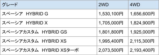 新型スペーシアのグレード構成は、標準モデルのスペーシアと上級モデルのスペーシアカスタムの二つがあります。スペーシアの価格帯は153万100円から182万4,900円、スペーシアカスタムは180万1,800円から219万3,400円となっています。