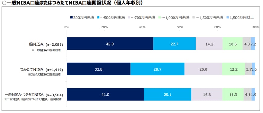 一般NISA口座開設者と、つみたてNISA口座開設者の年収別の割合と、一般NISA口座またはつみたてNISA口座開設者の年収別の割合は以下のとおりです。