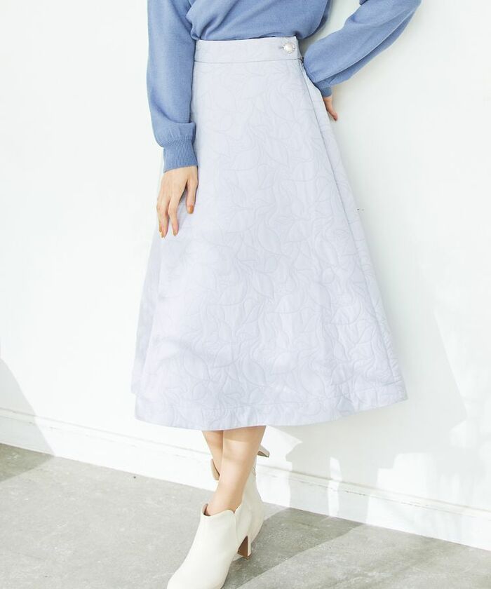 キルティングスカートには、ボタニカルな曲線のステッチが描かれていて大人かわいいデザインです。広がりすぎないシルエットで、細見え効果もあります。