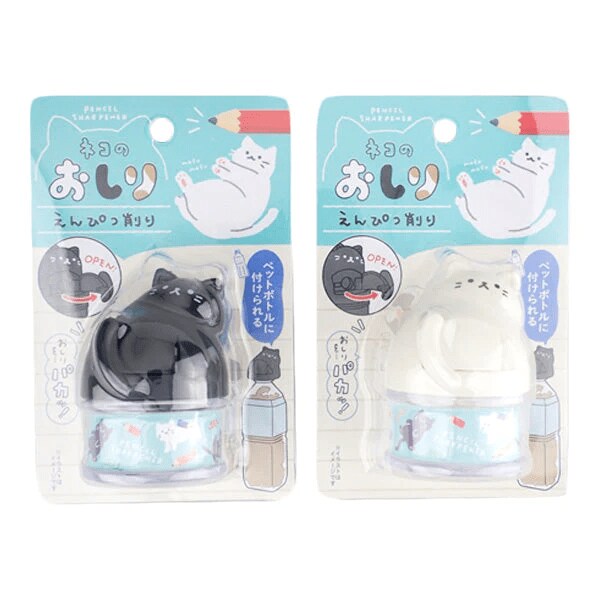 猫の形をしたミニサイズの鉛筆削り。ペットボトルに装着するタイプで、ゴミを捨てる回数を減らせます。お尻部分のキャップのデザインまでこだわられており、見てるだけで癒されるアイテムです。